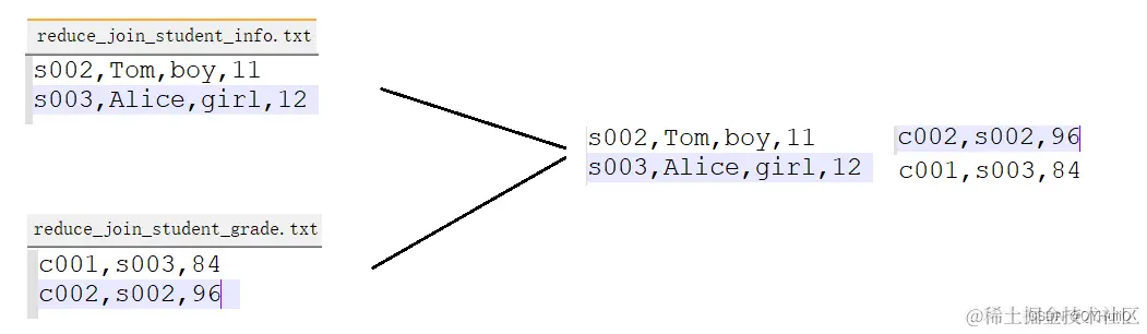 * 要想使两个数据文件产生关联,那么K2应该是两个表中的学生id,V2是各自原始的行文本数据