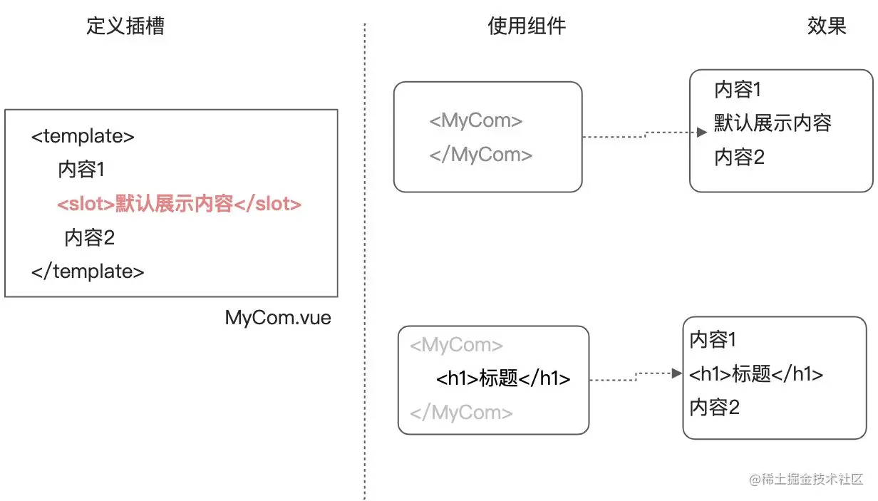 - 用于实现组件的内容分发, 通过 slot 标签, 可以接收到写在组件标签内的内容