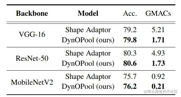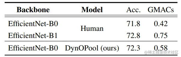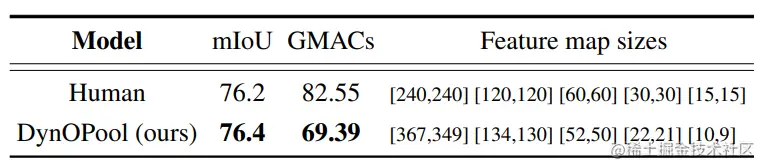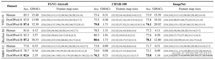 表1 人工设计模型与使用DynOPool模型的精度(%)和GMACs比较