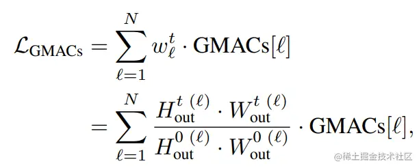 为了最大化模型的精度,DynOPool有时会有较大的比例因子,增加了中间特征图的分辨率。因此,为了约束计算代价,减少模型规模,引入了一个额外的损失项LGMACs,它由每次训练迭代t的分层GMACs计数的简单加权和给出,如下所示: