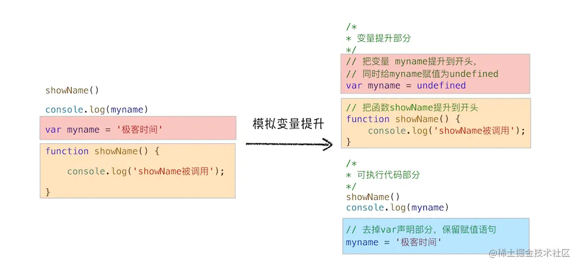myname和函数showName,并给变量设置默认值undefined; - 第二处是移除原本声明的变量和函数,如var myname = '极客时间'的语句,移除了