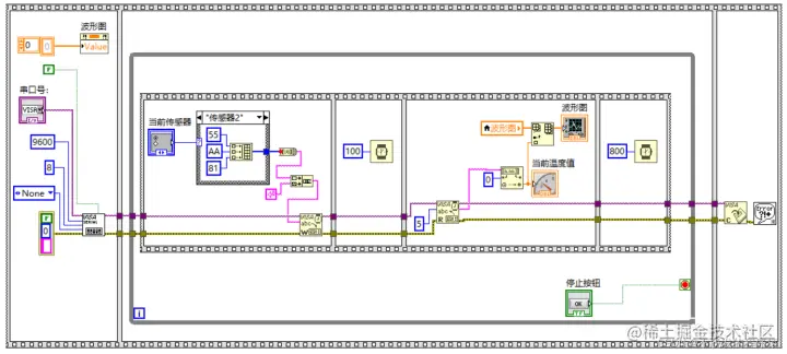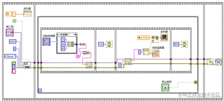 LabVIEW上位机主程序的结构为顺序结构+While循环。首先,在顺序结构中的第帧中,通过设置的串口号来初始化串口通信,并将波形图清空。然后,程序进入While循环和平铺式顺序结构,向Arduino Uno控制器发送传感器1或传感器2温度测量的命令码,等待100ms,接收到返回的温度之后,显示在前面板上并显示出温度波形。最后关闭串口通信。
