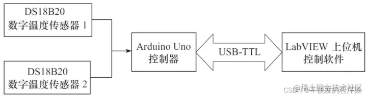 其中,2个DS18B20温度传感器并联接至单总线,Arduino Uno作为下位机,负责DS18B20的读写以及数据传输;LabVIEW编写的显示软件作为上位机,上下位机利用USB-TTL接口实现通信。