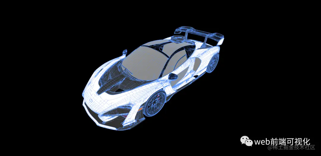 由于汽车由许多mesh组成,因此需要将所有的mesh都转换为EdgesGeometry材质,组合成LineSegments的网格对象,将所有新生成的网格对象放入一个group中,在场景中加入,就可以得到带有边框的汽车模型了。