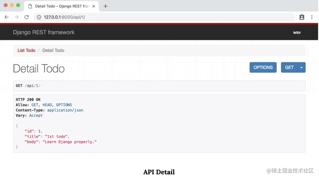我们还为每个模型制作了一个 DetailTodo 视图。 这称为实例,在 http://127.0.0.1:8000/api/1/ 上可见。