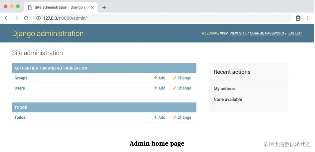 现在,我们可以使用内置的 Django 管理应用程序与我们的数据库进行交互。 如果我们立即进入管理员,我们的Todo 应用程序将不会出现。 我们需要通过 todos/admin.py 文件显式添加它,如下所示。