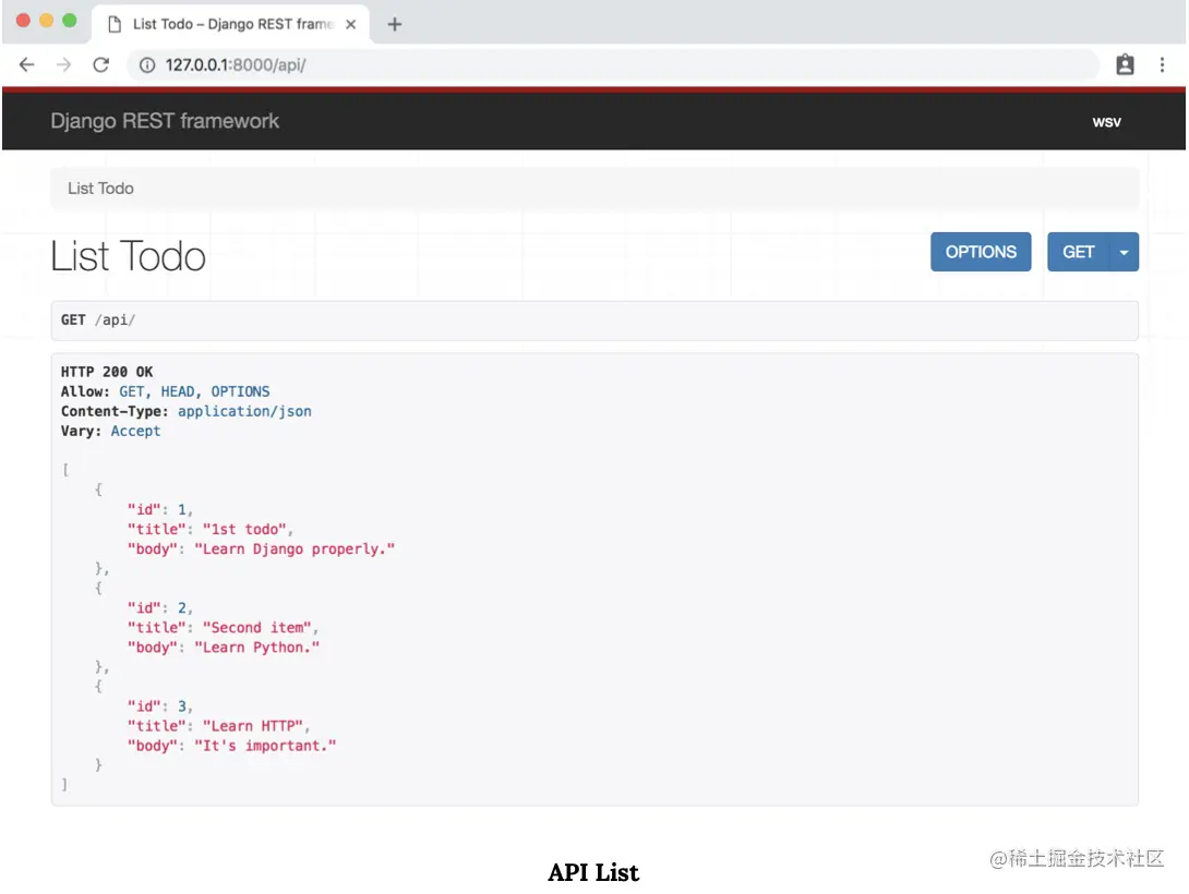 在“列表待办事项”下显示 GET/api/ ,它告诉我们我们在此端点上执行了 GET 。 下方显示的是 HTTP 200 OK ,这是我们的状态代码,一切正常。 最重要的是,它下面显示允许:GET,HEAD,OPTIONS。 请注意,由于这是一个只读端点,因此不包括 POST,我们只能执行 GET。