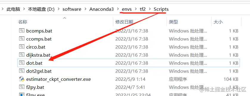 我们可以通过anaconda先安装好graphviz,本人的系统环境是windows,先使用是conda创建了一个虚拟环境,安装好后,我们就可以在anaconda目录\envs\环境名\Script下找到dot.bat这样我们就可以使用这个工具将我们的生成的dot文件变成pdf或者png。我的位置如下: