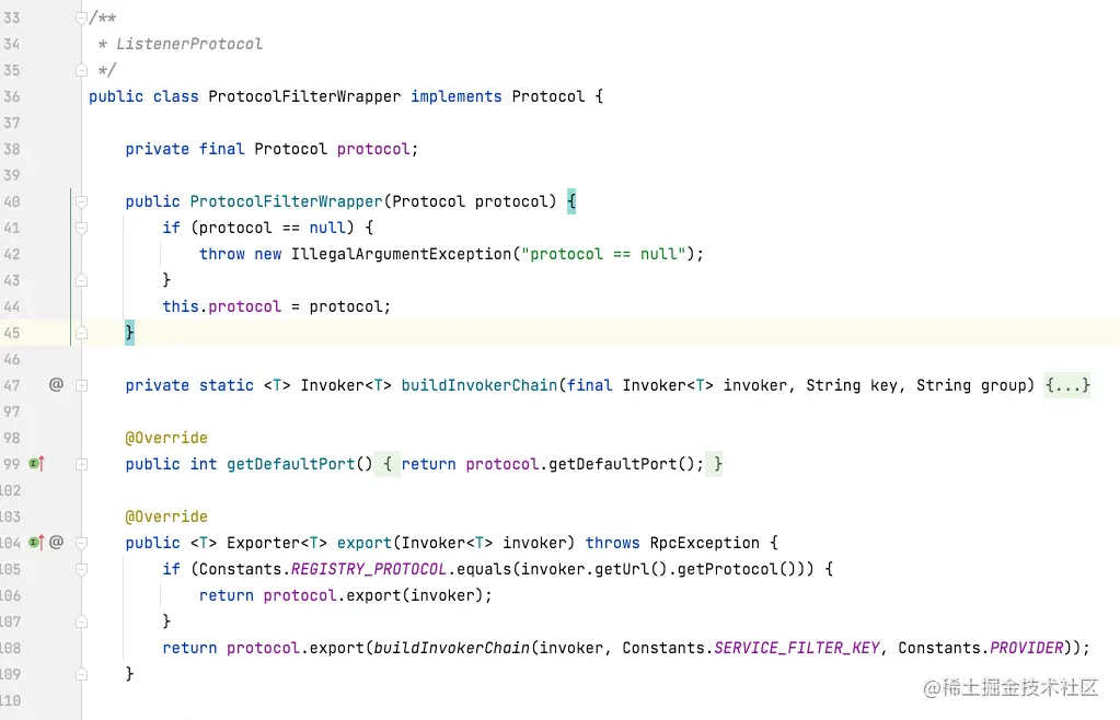 这里我们看下ProtocolFilterWrapper这个类,它是一个wrapper类。并且它有一个成员变量,实际上这个变量就是通过有参构造给赋值的,也就是里层的wrapper类