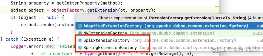 下面我们来看一下Dubbo SPI提供的依赖注入功能,Dubbo的依赖注入功能实现的比较简单,它只支持set注入,我们主要看下injectExtension方法就会明白