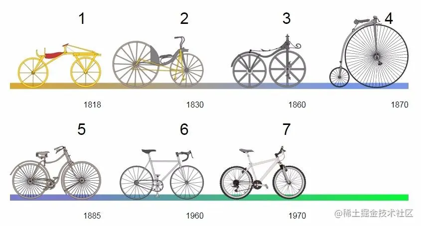下图中一共有7种自行车,从1到7是不断进步的过程。这些自行车是有一些共同的属性的,两个轮子,一个坐垫等。它们也有不同的地方,有的驱动是前轮驱动,有的是后轮驱动,有的是两轮驱动,有的可以变速,有的不能变速,有的适合平路,有的适合山路,有的适合爬坡有的不适合爬坡。