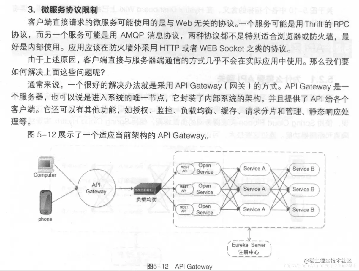 上面这种情况,压根儿是不现实的。所以一般微服务架构中都必然会设计一个网关在里面,像android、ios、pc前端、微信小程序、H5等等,不用去关心后端有几百个服务,就知道有一个网关,所有请求都往网关走,网关会根据请求中的一些特征,将请求转发给后端的各个服务。