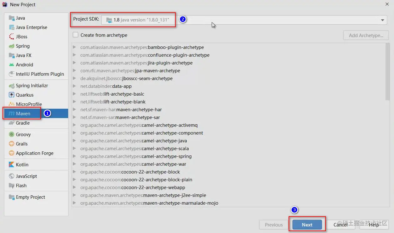 在New Project对话框的左侧选中Maven,在右侧确认JDK版本无误后,即可点击Next到下一步:
