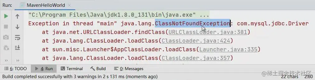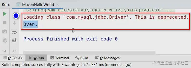 当下载完成后,在pom.xml中的代码就不会报错了,再次运行项目时,可以看到已经成功的加载了MySQL的驱动类: