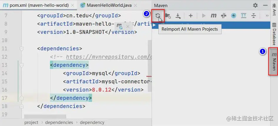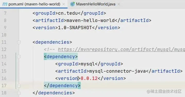 添加这段代码时,不需要关心所使用的依赖的版本,因为本次案例的目的就只是为了测试是否可以从Maven仓库中下载所需的jar包并使用而已,并不会真的连接数据库,甚至也不一定加载这个类,加载其它类也是可以的。