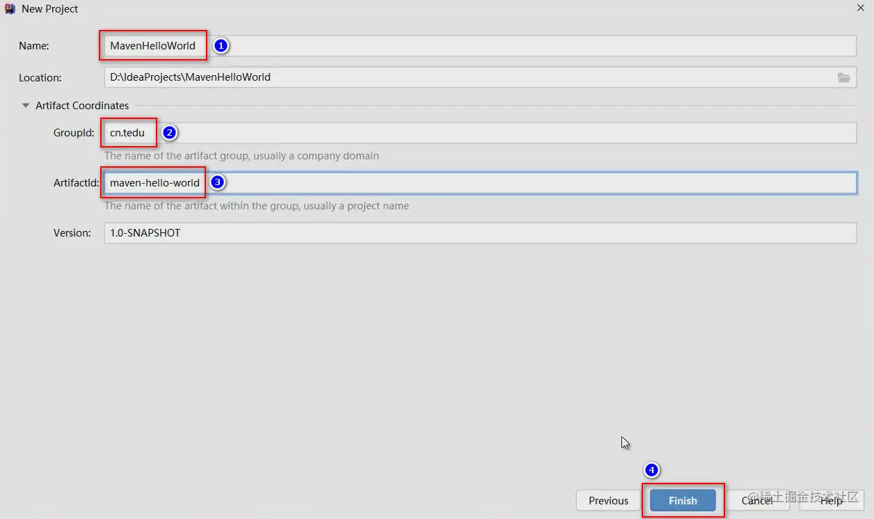 先确定项目的名称,检查项目的保存位置,并展开Artifact Coordinates,填写GroupId与ArtifactId,其实这2项并不是必须填写的,按照开发规范应该填写,而且,ArtifactId的值应该全部由小写字母组成,如果由多个单词组成,则各单词之间使用减号进行分隔,全部填写无误后,点击Finish按钮即可完成创建: