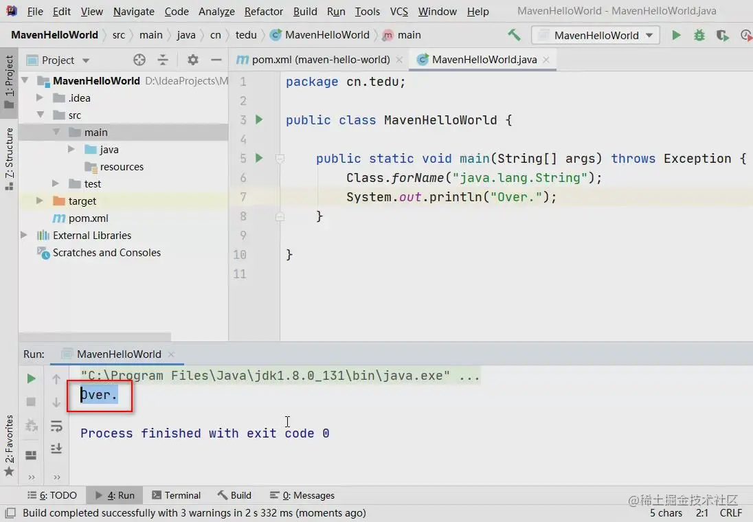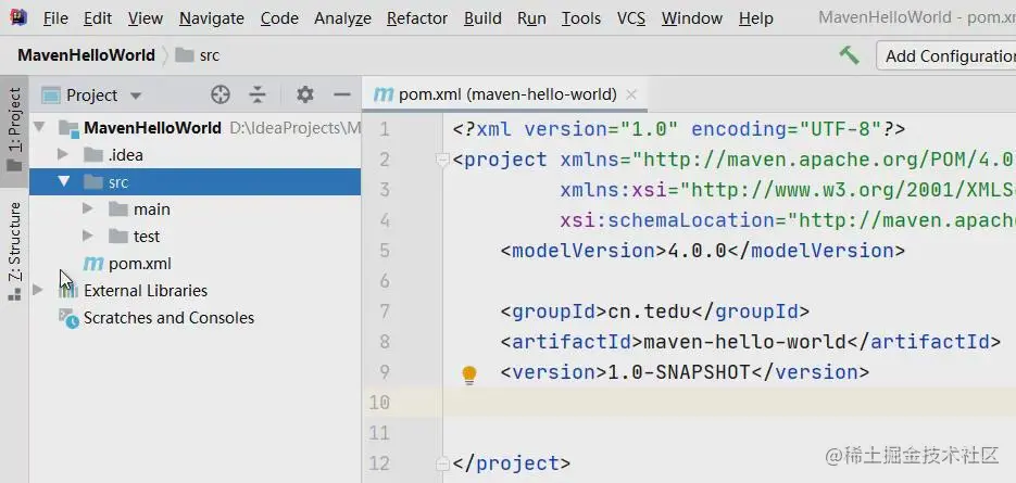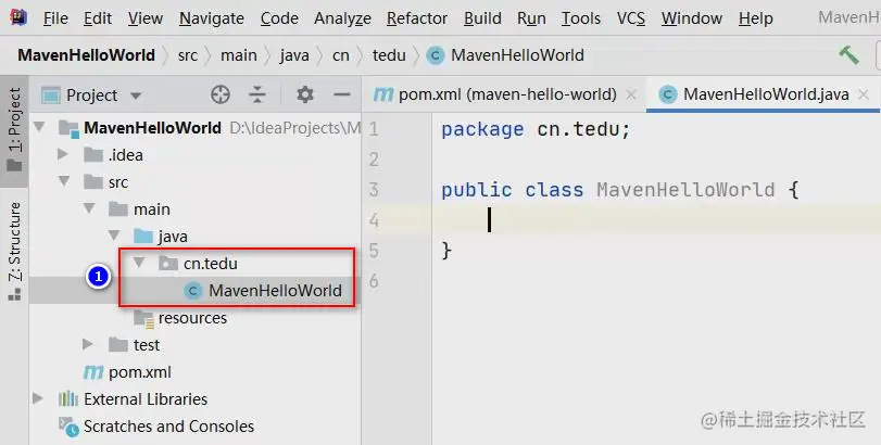 先在项目中创建cn.tedu包,在这个包中创建MavenHelloWorld类: