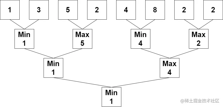 - 对于每个 0 <= i < n / 2 的偶数索引 i ,将 newNums[i] 的值设置为 min(nums[2 * i], nums[2 * i + 1]) 。