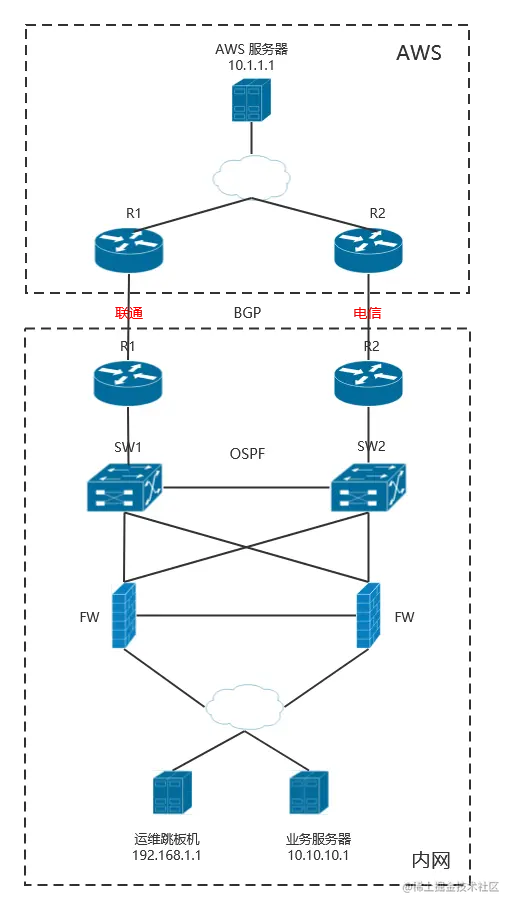 简化了架构,实际上 R1 和 R2 分属于双数据中心,下连内部区域实际也为两个同类区域。