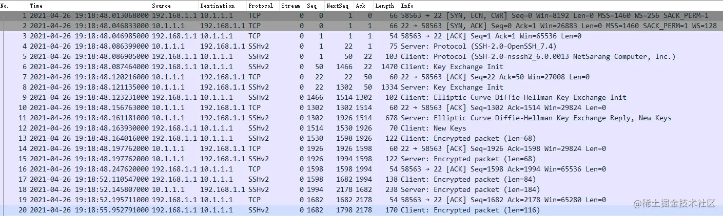 因为 SSH 协议较为简单,且问题现象较为明确,则在问题复现时直接抓包分析。