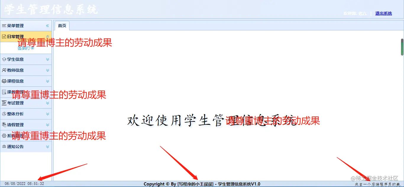 介 绍:①本篇博客展示🧐学生管理信息系统🧐的整体功能,通过本系统可以帮助在校学生🏃一起学习进步,同时纪念端午期间的劳动成果。②系统中采用的最基础的技术实现的代码,每一行代码均是博主所写,代码中部分注释不全或有bug出现,请私信或联系博主,博主👨🏫25h时刻为您服务🍌🍌🍌,同时也可根据需要增删相应功能。