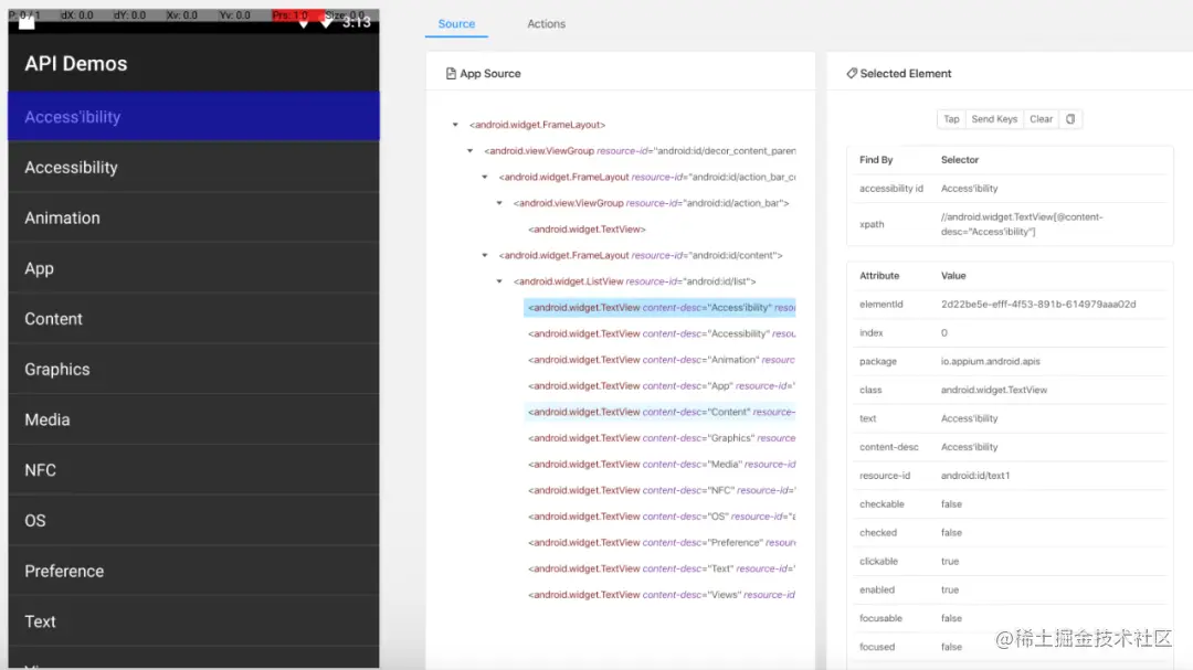 通过图片分析,android.widget.TextView 是文本类型的节点,其中包含的属性信息都在上面的 uiautomatorviewer 快照图中有展示。如果只想定位 Android 系统的页面元素,可以直接使用 uiautomatorviewer,速度快并且不需要配置任何参数,直接点击获取页面的图标就可以将客户端页面抓取出来。
