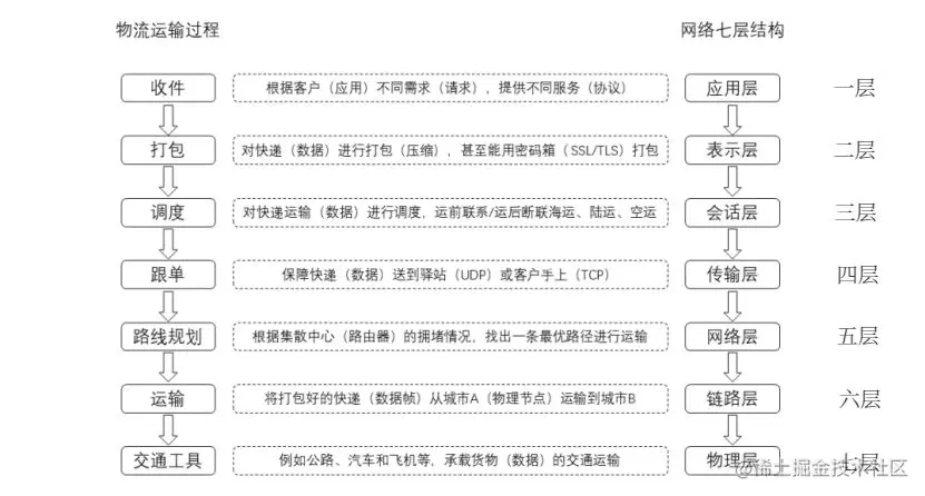 整个网络当中,最基本或者是最核心的就是数据的传输,整个网络的搭建,都是为数据传输服务的,我们类比一下快递物流的例子,就可以初步理解这七层都是干嘛的了: