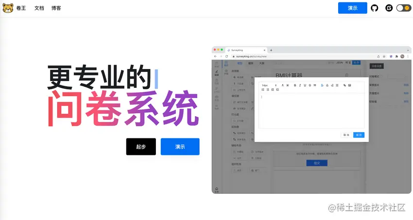 SurveyKing(卷王) 是一个开源免费、功能强大、稳定的调查问卷系统,安装使用非常简单,支持多种数据库,内置20多种题型, 支持多人协作管理问卷。