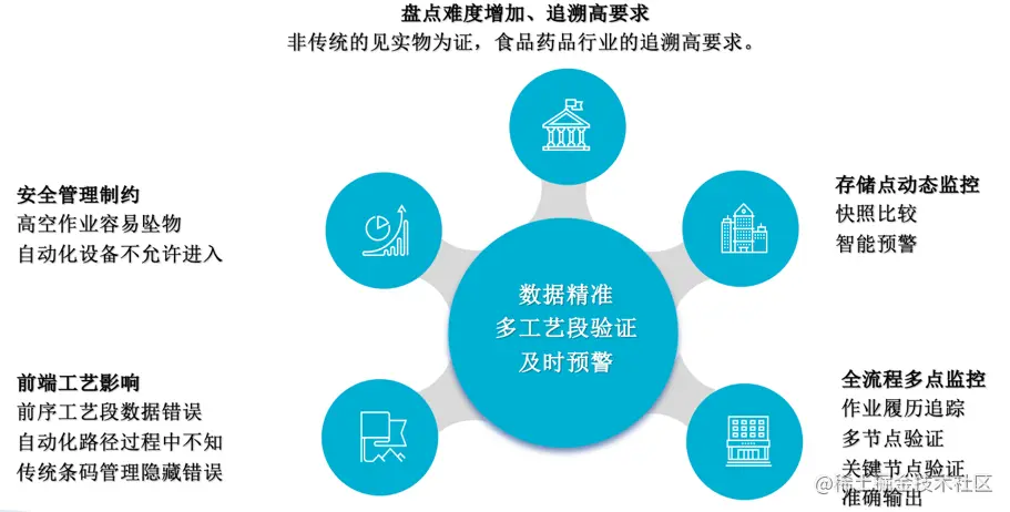 针对这一趋势下的多功能智能化物流仓进行智能盘点,相较传统物流仓而言,其难度也增加了不少,主要包括:前端工艺、安全管理制约、存储点动态监控、全流程多点监控等,如图 3 所示。
