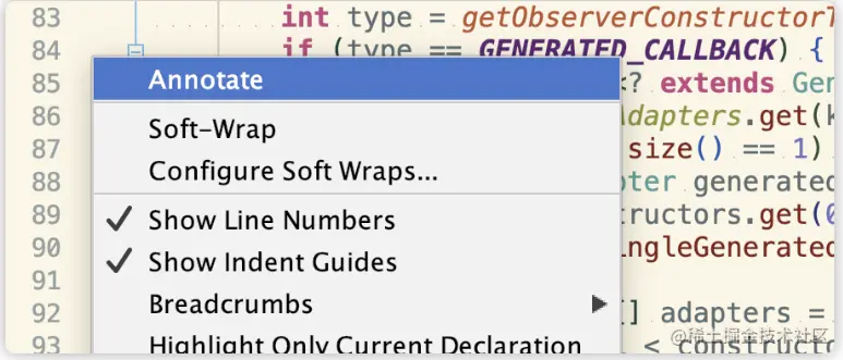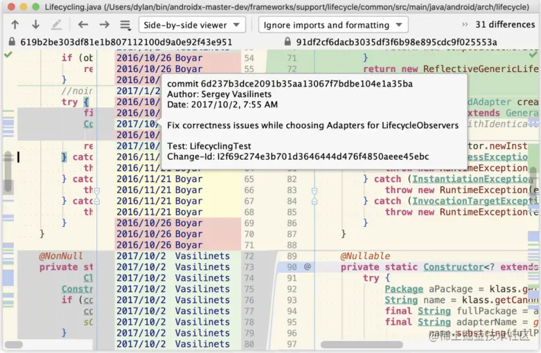 比如Lifecycling的lifecycleEventObserver()方法比较复杂,刚开始不太能理解这个方法封装注解解析后的监听者那部分逻辑。可以使用以下方法查看这几行的提交记录,方便理解。