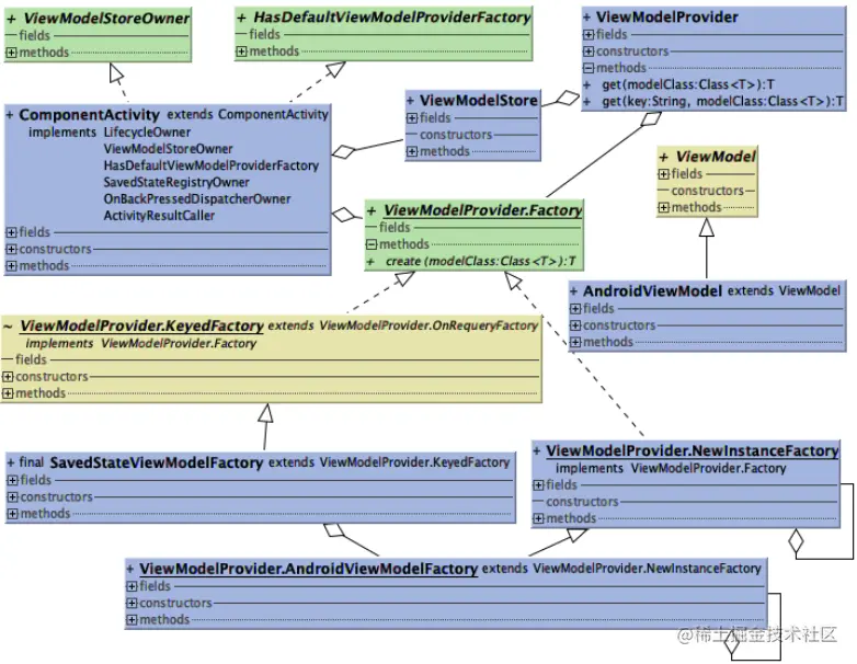 ViewModel通过ViewModelProvider的get()方法获取到,ViewModelProvider由缓存ViewModelStore和创建工厂ViewModelProvider.Factory组合而成,ViewModelStore和ViewModelProvider.Factory也是ComponentActivity的一部分,ComponentActivity通过实现ViewModelStoreOwner和HasDefaultViewModelProviderFactory两个接口对外提供ViewModelStore和ViewModelProvider.Factory。其中,ViewModelProvider.Factory在ComponentActivity的具体实现是SavedStateViewModelFactory,SavedStateViewModelFactory一部分由AndroidViewModelFactory组合而成,它提供创建三种ViewModel的能力,其中普通ViewModel的创建是由AndroidViewModelFactory的父类NewInstanceFactory完成。