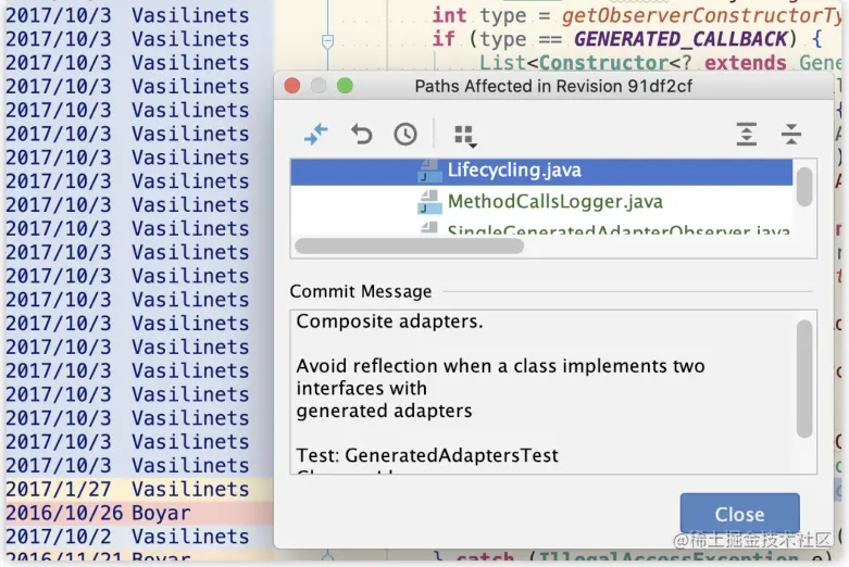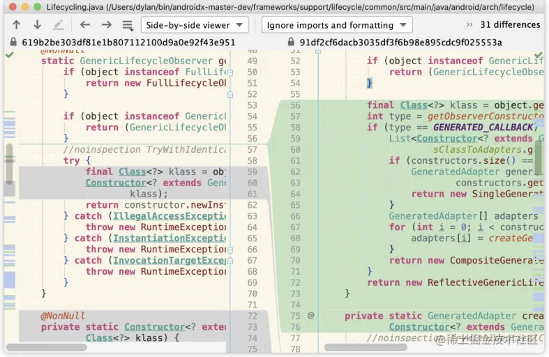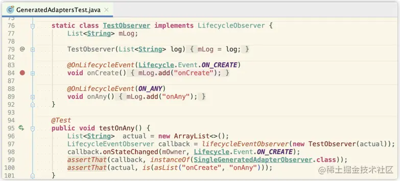 以本例来说,可以看出旧getObserverConstructorType()方法是直接返回构造对象,这个构造对象可能是注解处理器生成的类的,也可能是普通监听者需要用反射处理的类的,然后用这个构造对象创建出监听器的封装。而这次修改了getObserverConstructorType()返回为解析后的结果类型,包括REFLECTIVE_CALLBACK和GENERATED_CALLBACK,再用这个类型和getObserverConstructorType()方法中解析的缓存判断应该创建哪个监听器的封装对象。这次增加的功能点是对实现多个LifecycleObserver接口的监听器的支持,可以在单元测试类GeneratedAdapterTest中找到具体使用示例。