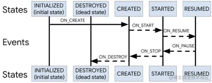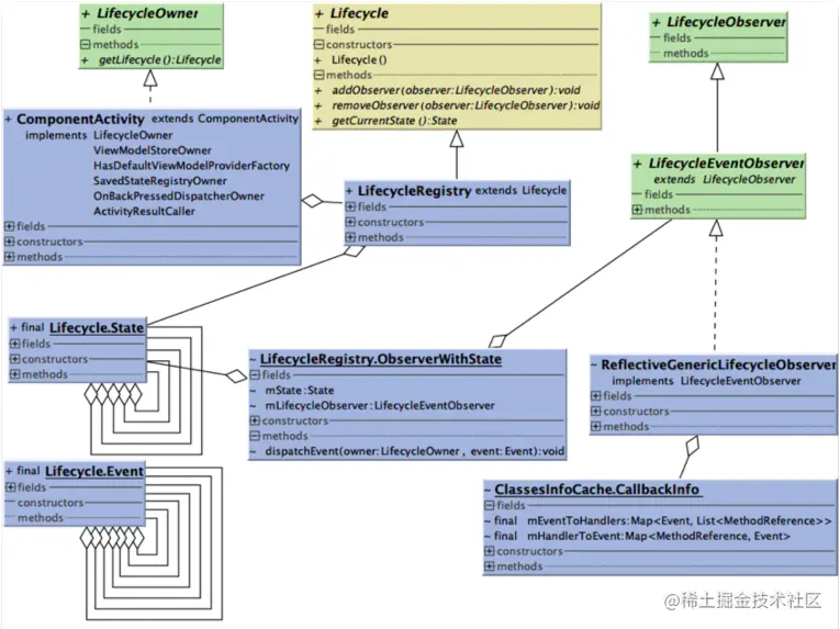 该方法是从使用细节出发,提出问题,再进入源码中探究答案,最后汇总出组件关系图,获得上层视角。在这里以自下向上的方法,分析一下LifeCycle的源码。