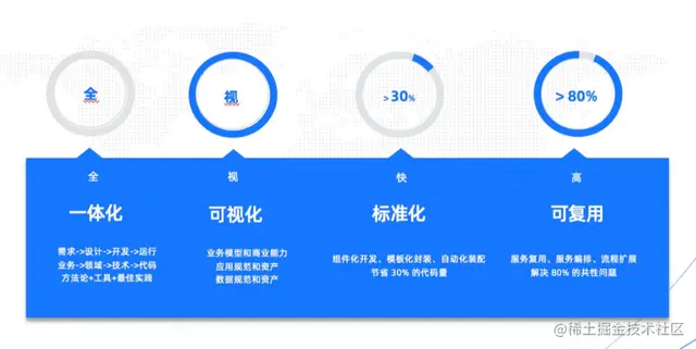 通过研发体系组件化、标准化、规范化,可减少30%代码量,有效提升研发效率。通过服务流程的可复用可扩展,能解决80%的共性流程问题,支撑业务快速迭代。