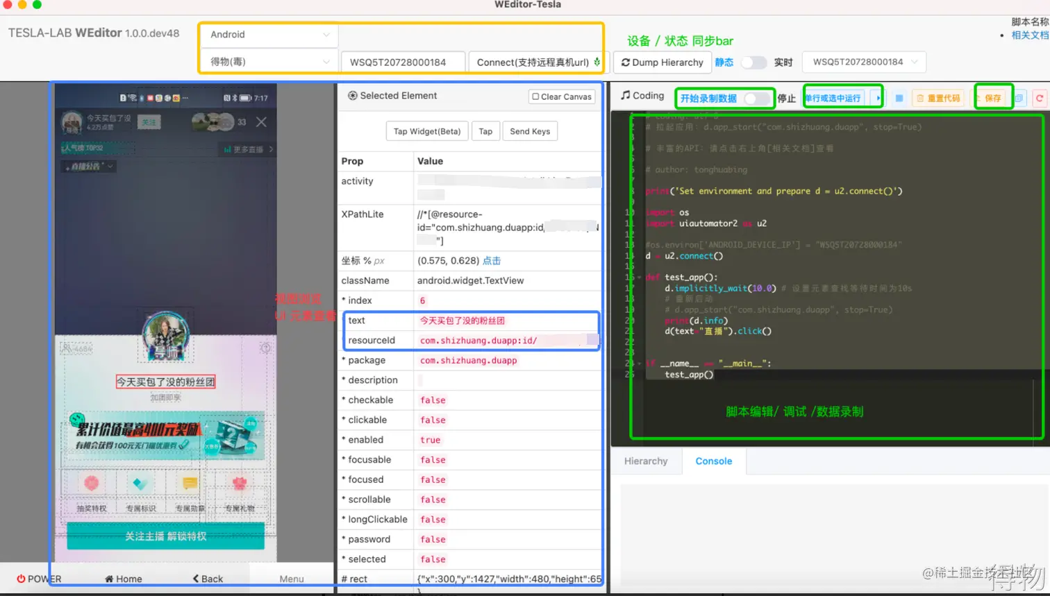 - 支持手动编写或者通过点击页面生成对应代码,支持运行/暂停来调试脚本