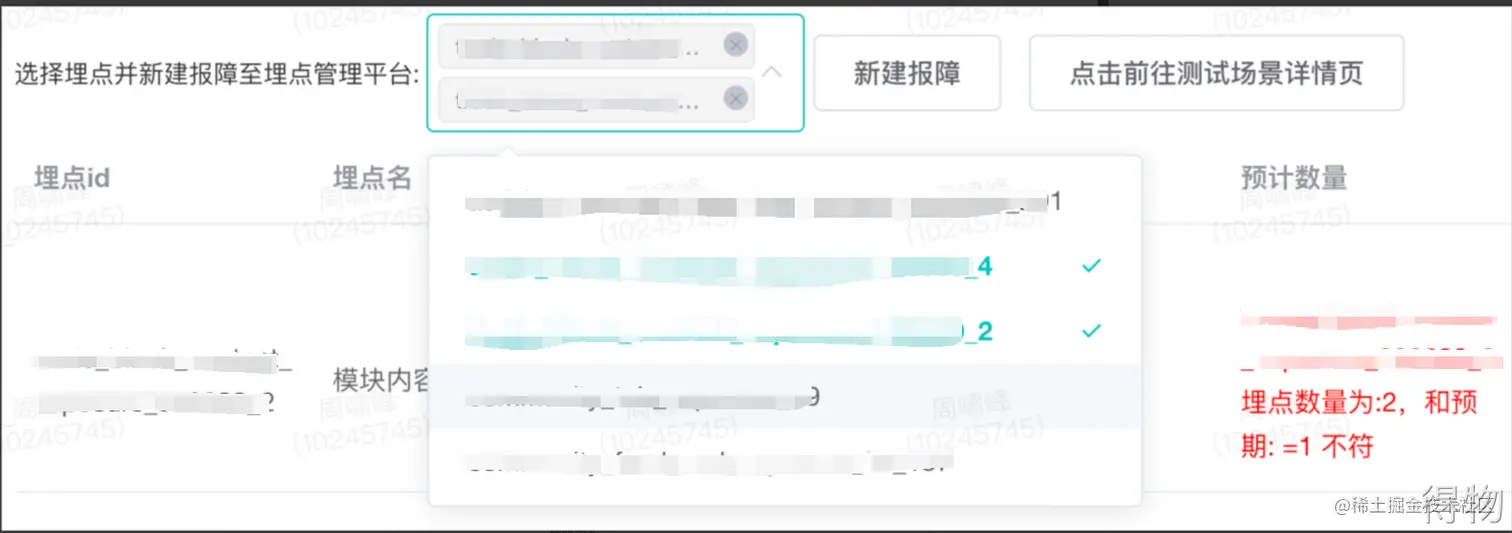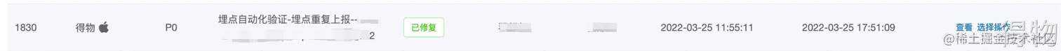 - 订正之后重新进行校验,产出的报告通过率通常会提升至75%左右,剩下的异常部分通常由一些随机因素导致(例如时间戳,页面浏览时长)。此时剩余问题较少,可以直接人工尝试复现,经确认后即可选择埋点并提交报障至埋点管理平台。