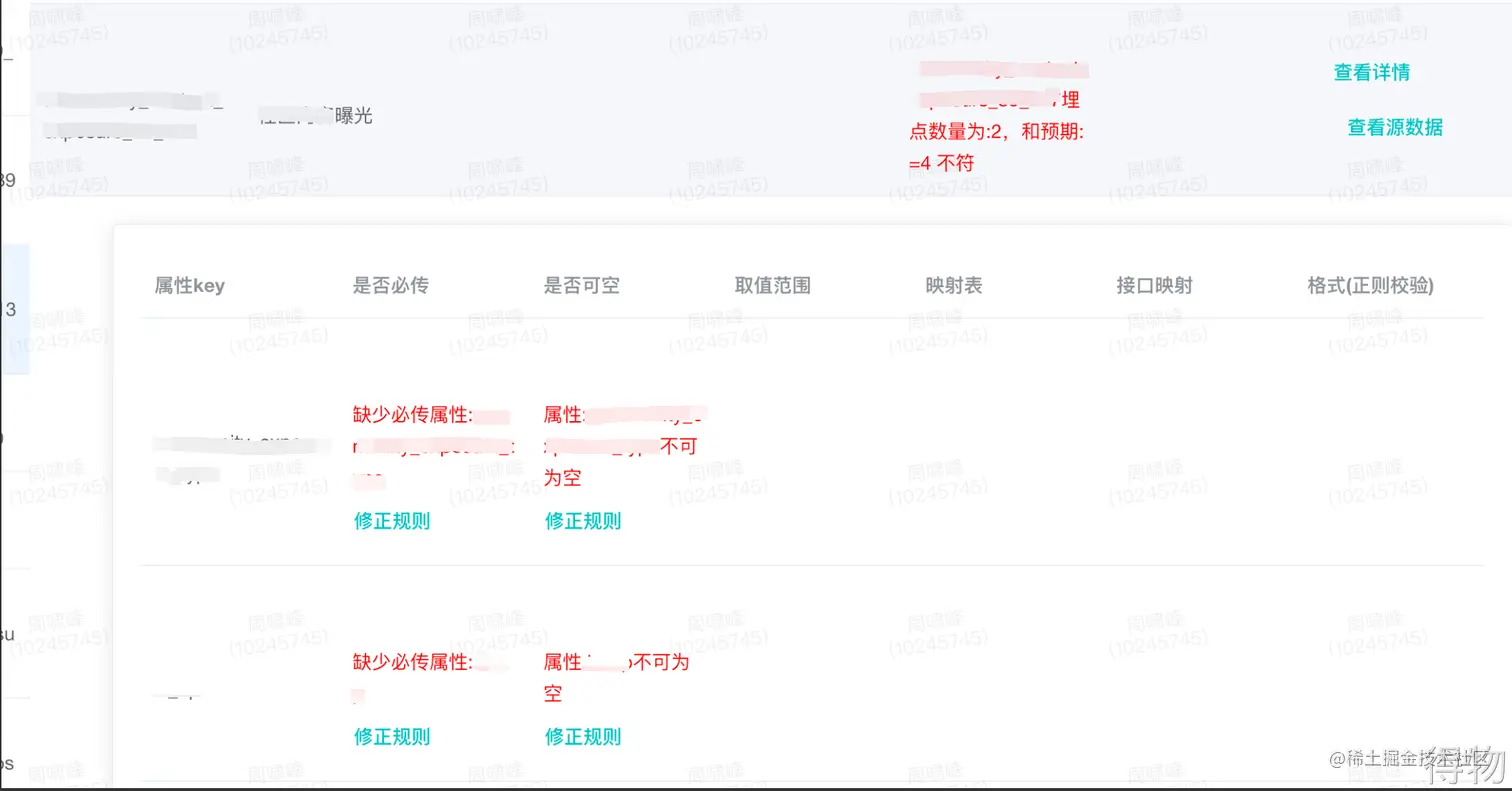 - 埋点的详情数据均来自埋点管理系统,自动生成的规则也是根据埋点管理平台中埋点属性是否必传的标注来生成,但是大部分埋点属性是否必传并非绝对情况,在不同的应用场景下可能必传也可能不必传,这导致我们产出的验证报告中一直有大量噪声。为此我们实现了在报告中对规则快速修复以及接口映射规则,在迅速消除噪声的同时也建立起埋点数据和接口数据的映射关系,从根源上对埋点数据进行校验。虽然在修复上线后由于商详接口的问题整体的验证报告通过率并未大幅度提升,但是在修复后的单个版本就发现了数十个埋点问题。