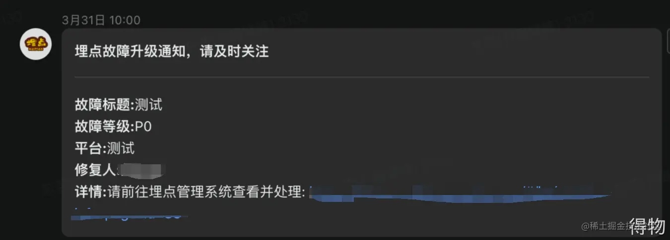- 埋点管理平台将发送飞书通知至最近负责过此埋点的研发,研发修复问题之后会飞书通知最近负责过的测试,经测试和报障发起人验收之后报障流程结束。如果问题在修复或者验收阶段停留超过一定时间将上升并飞书通知负责人leader。