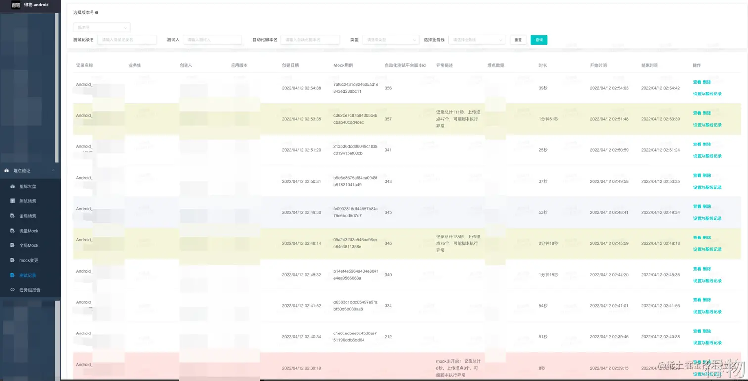 测试记录由移动端数据采集sdk创建,会根据端上上传的监控信息进行比对,如果有异常会飞书报警。