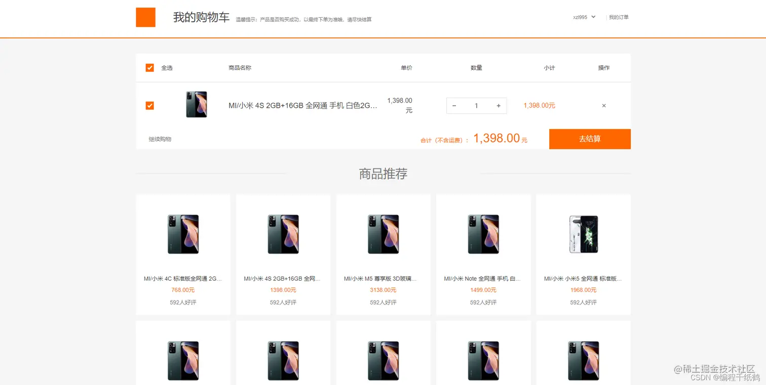 用户在商城看到想要购买的商品时,可以将商品选择加入购物车,加入购物车后,可以点击界面右侧的购物车图标,可以查看购物车中的商品信息,包括商品名称、商品数量、商品价格等信息,如图5.4所示。