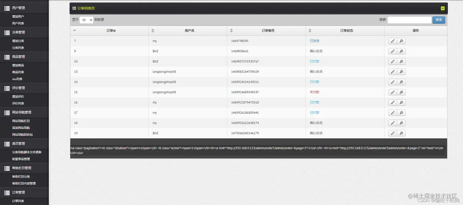 在订单管理模块管理员可以对实物订单进行管理,在订单管理模块中可以查看不同状态的订单,点击修改按钮,可以修改订单状态信息等,订单列表如图3.10所示界面。
