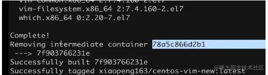 这里running的一个id是build过程中新的临时的container的ID,然后再里面通过RUN指令来安装vim,然后执行完之后移除了: