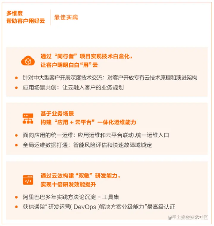 第一,真金不怕火炼。我们通过“同行者项目”,去推动整个云计算的技术白盒化,我们有底气把云计算“解剖”出来,与我们的客户讲清楚云计算的原理是什么,我们的设计理念是什么,设计的优势和局限分别是什么。通过这种方式,帮助客户更好地理解云计算的内部原理,从而更好地把云放入整体技术规划中。 第二,授人以鱼不如授人以渔。我们把阿里巴巴过去近20年在运维领域的经验抽象总结出来,基于阿里巴巴的最佳实践,构建了“应用+云平台”的一体化运维方式,帮助客户端到端完成整体的业务安全生产建设和运维能力建设。此外,基于业务场景,我们提供方法论和完整的应用运维平台,便于与客户的业务更好地联动,让云应用平台成为客户整体运营平台一部分,最终实现运维平台的应用评级以及全链路协同的安全生产体系。 第三,机会总是留给有准备的人。面向未来的云原生时代,我们的云效拥有构建研发敏捷和组织敏捷的“双敏”能力。它来自于阿里巴巴过去近20年的研发体系构建经验,阿里巴巴内部同样也在使用。现在,我们把它命名为“云效”,输入到客户端,来帮助客户加速整个应用的云原生改造,把业务从传统的研发模式牵引到云原生的方式,构建“组织敏捷和研发敏捷”的“双敏能力”,最终实现十倍研发效能提升,让客户获得用好云的最佳实践。