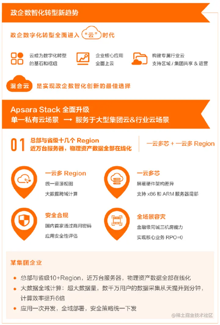 第一,阿里云公共云最新最先进的云计算技术,在阿里云专有云中亦得以实现,让专有云具备了“一云多芯、一云多Region”以及“全场景灾备”的能力。这其中的部分能力所体现的企业级特性,甚至比公共云更胜一筹,以更好地满足政企客户的核心诉求。可以说,阿里云专有云在有些方面可以做到“青出于蓝而胜于蓝”。之后,专有云不仅因与公共云同宗同源而自信,公共云也会为专有云的企业级特性而感到骄傲。 第二,再度升级“管云”的能力,从原来可管理、可运维的云,逐步升级为可运营的云。从运维到运营的能力拓展,意味着阿里云混合云对云基础设施的“管理”升级到对云基础设施的“治理”,通过治理解决整个集团的IT、整个技术架构演进以及成本控制、对外运营等方面的问题。 第三,升级了部署架构。除了现在支持的中心云以外,我们的产品版本能力已经可以支持边缘计算,真正实现云边一体的混合云架构体系。这个从中心云到边缘的完整模式,得益于阿里云混合云业界领先的完整技术架构体系。