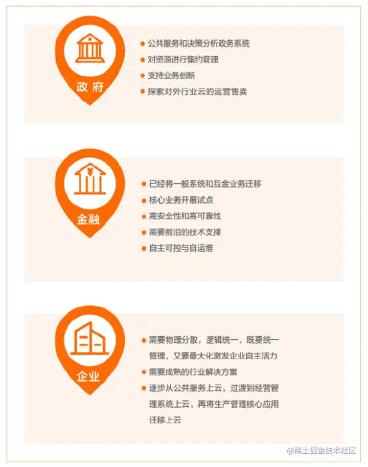 金融:大部分金融机构已经将泛互联网类新型业务建在云上,同时在被称为“银行IT皇冠上的明珠”的核心系统领域上积极开展上云试点。金融客户对于安全性和可靠性的要求非常高,需要前沿的技术支撑,并需要实现自主可控与自运维,以满足自身对于技术的可控性;