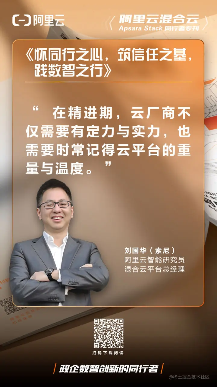 简介: 政企云平台处在怎样的历史阶段?数智创新的同行者们面临着怎样的挑战与机遇?在时代巨幕下,政企期待云厂商扮演怎样的角色?阿里云智能研究员、混合云平台总经理刘国华认为,云厂商不仅需要有定力与实力,也需要体会云平台的重量与温度。