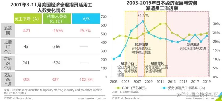 从国际经济视角看,灵活用工行业与经济发展周期高度相关。从美国、日本灵活用工发展可以看出,灵活用工的需求变化与经济发展息息相关: