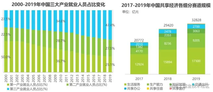 2000年以来,第三产业就业人数占比从27.5%增长至47.4%,更多劳动力流向第三产业。产业结构的变革激发了灵活用工市场的快速发展。共享经济等新业态的发展,促进了灵活用工方式被越来越多的企业和求职者所接受(求职者被动接受)。
