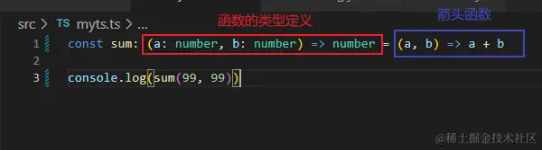 sum: (a: number, b: number) => number // 这一部分就是函数的类型,两个参数都要是number,返回值也得是number