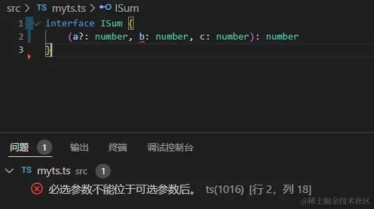 可选参数和对象中的可选属性一样,都是通过?:来定义。